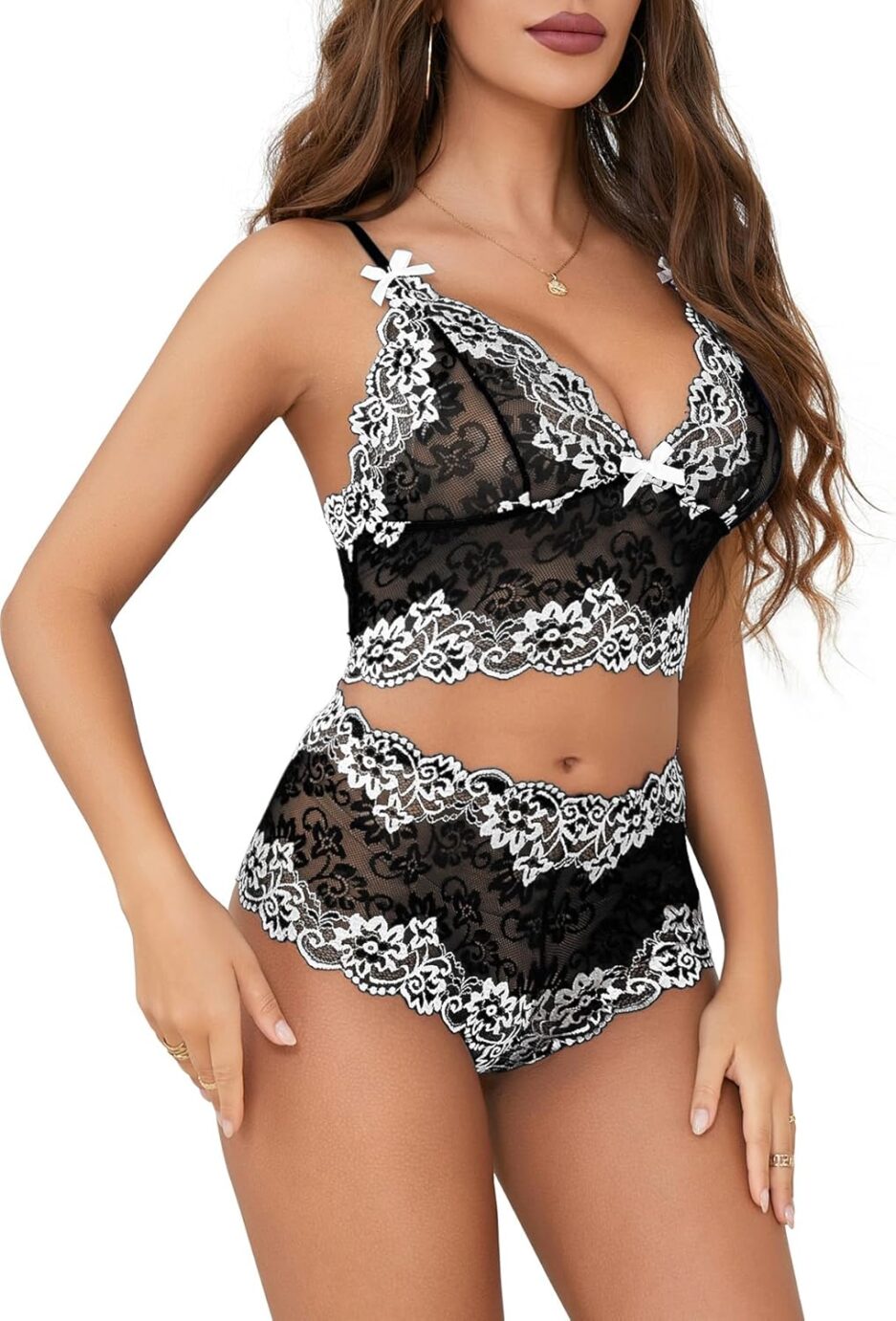 Sexy Women Lace Pajamas Lingerie Set High Waist Sheer Sleepwear Bow Ties Cami Shorts Bra and Panty